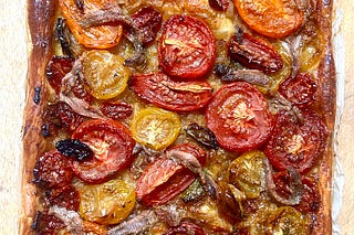 Slow-roasted tomato anchovy tart + mozzarella pesto swirls